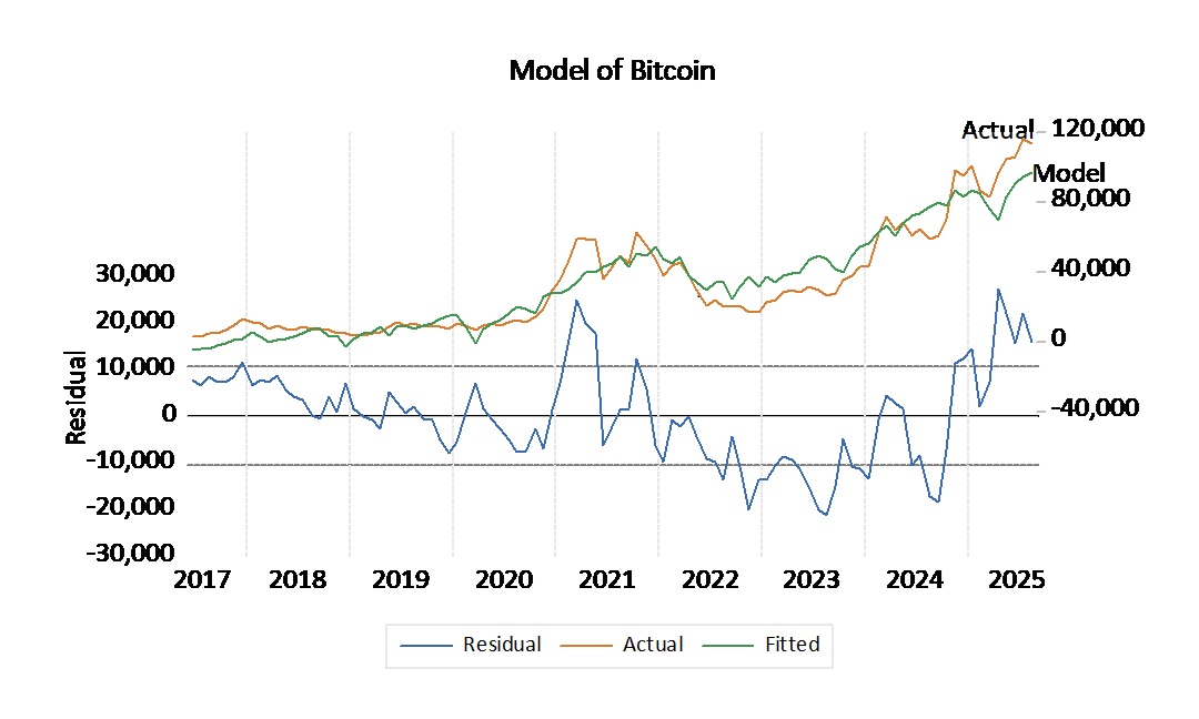Our model of Bitcoin based on this theory is shown in Figure 1 . We are surprised that this simple model explains 88% of monthly variation in Bitcoin since the beginning of 2019.
