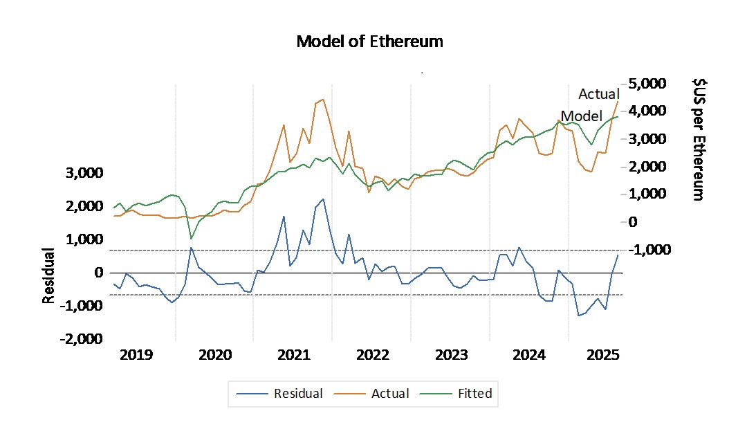 This model explains 70.1% of monthly variation since the beginning of 2019. Our model tells us that at the end of August, Ether at $US 4,378per token was $US 560 above our model estimate of $US3,818.00 . Ether is moderately overvalued.