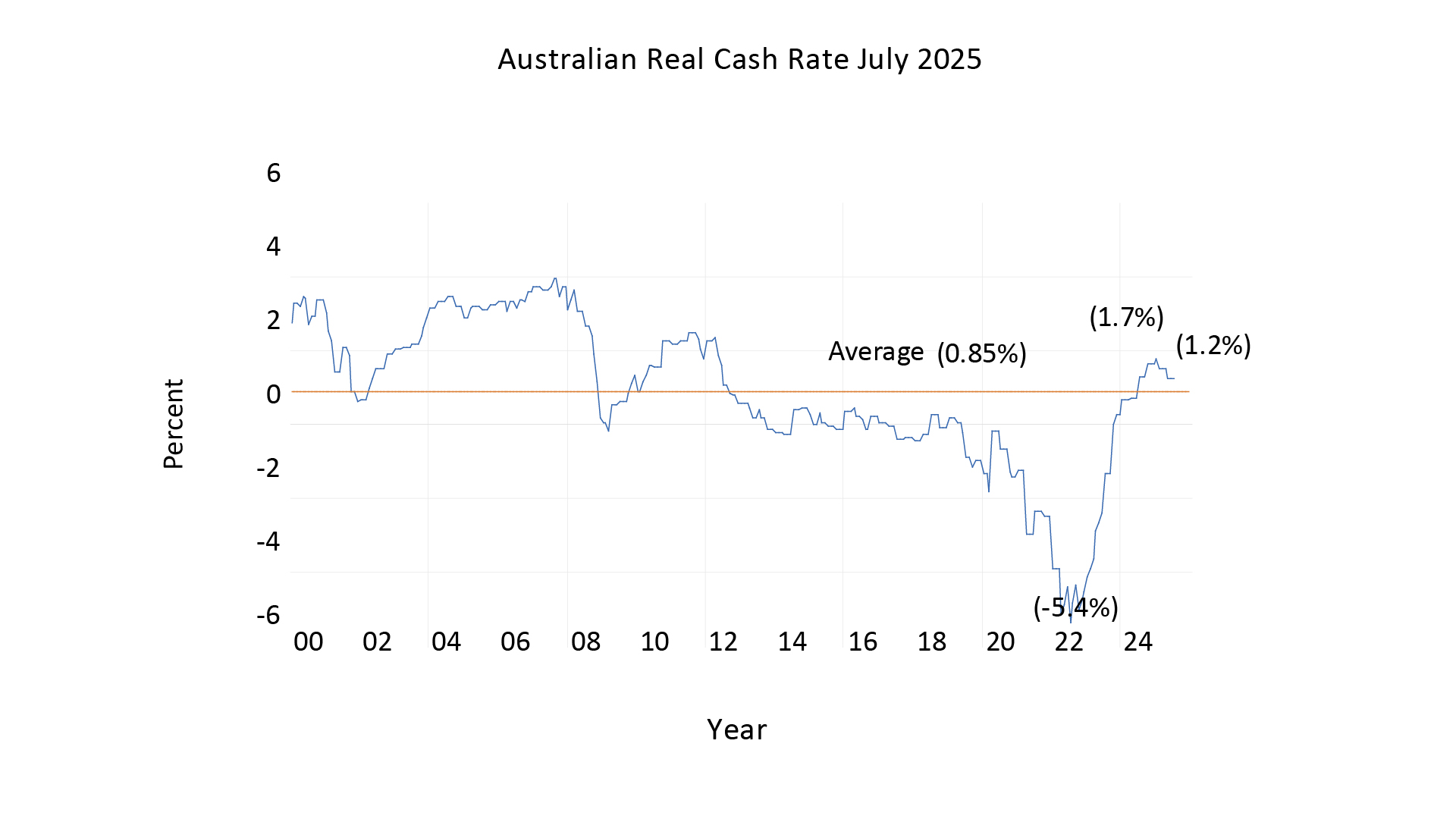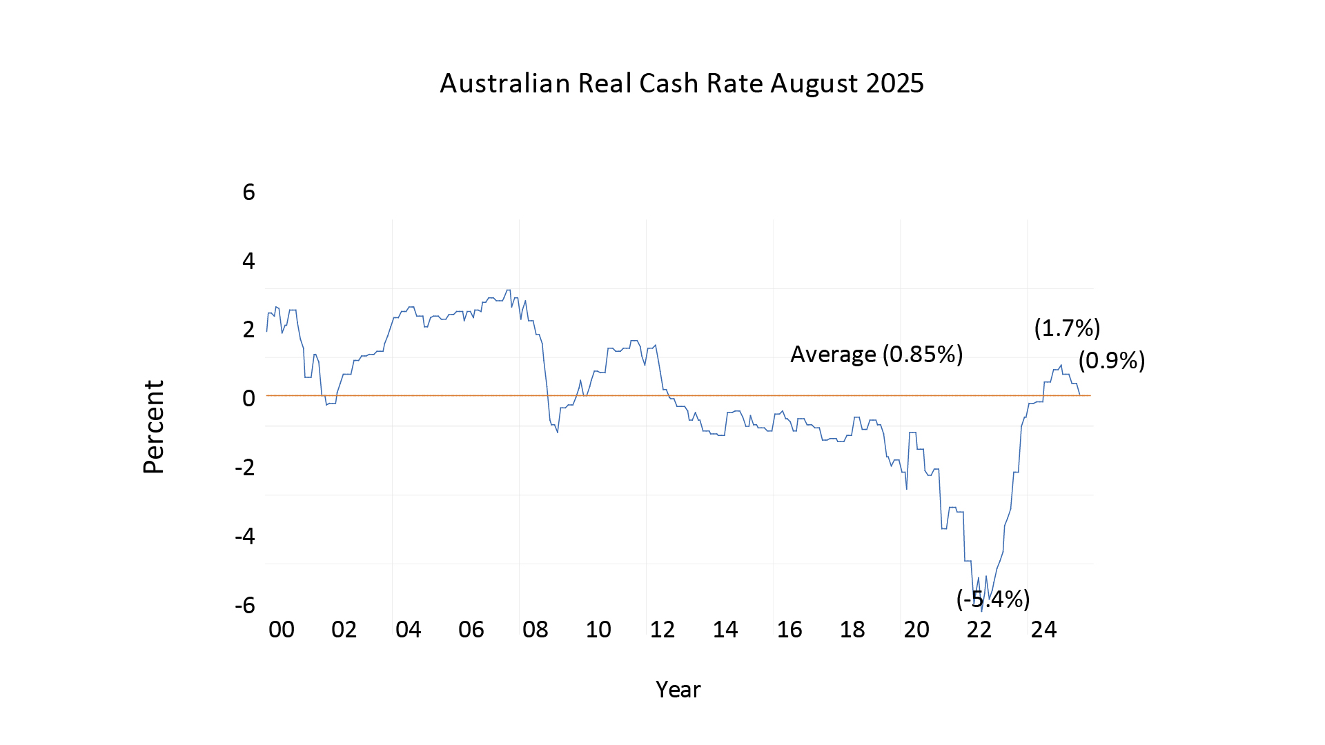 In Australia, the RBA aims to keep inflation at 2.5%. To achieve this, it sets a real interest rate, known as the neutral rate, which can only be determined in practice by observing what rate stabilises inflation at 2.5%. Looking at data from January 2000, we see significant fluctuations in Australia’s real cash rate, but over the long term, the average real rate has been 0.85%. This suggests that the RBA can maintain its 2.5% inflation target with an average real cash rate of 0.85%. This is a valuable insight as the RBA approaches this target.
