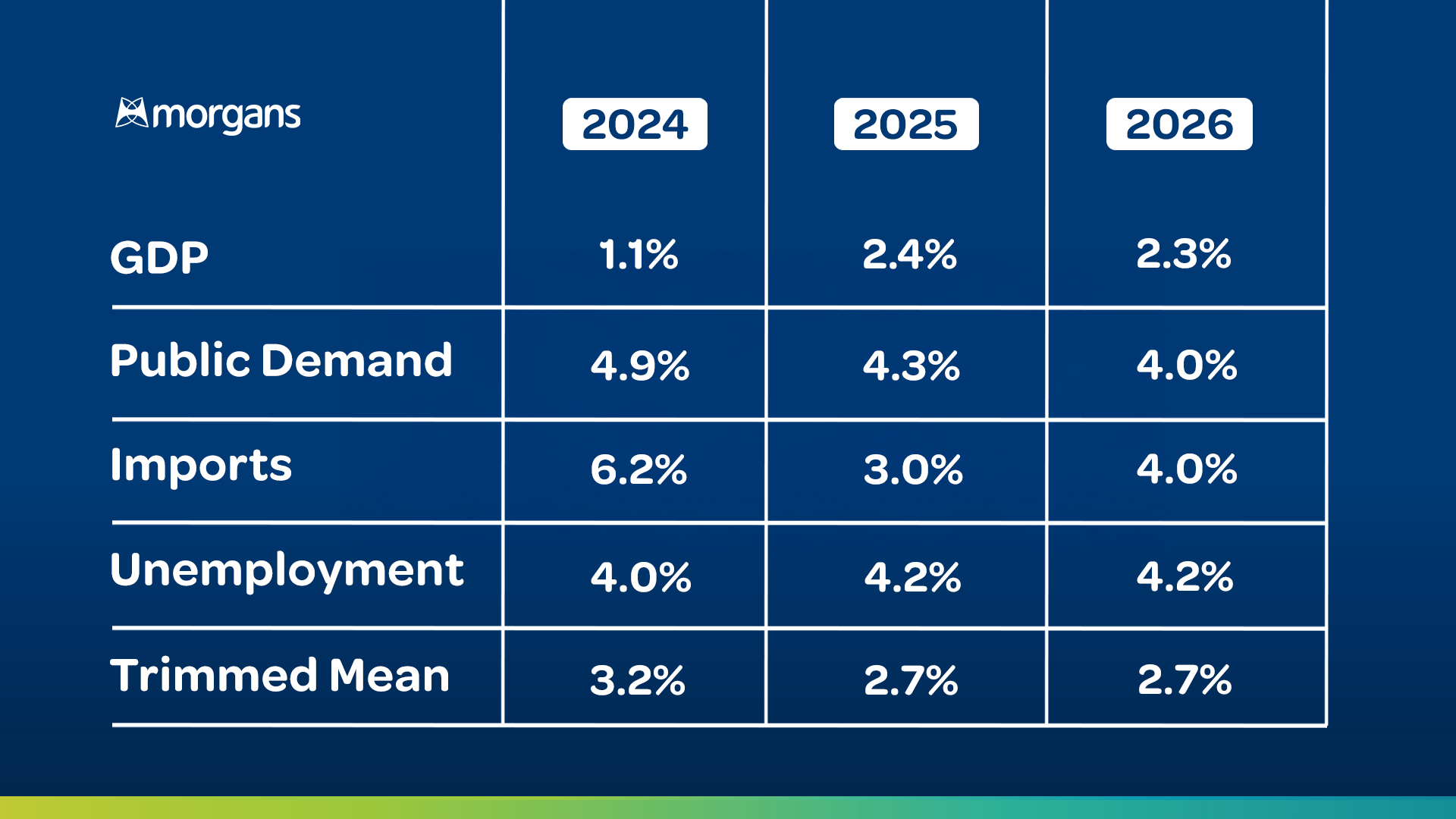 The unemployment rate, currently at 4%, is expected to rise slightly to 4.2% mid-year, where it is anticipated to remain. The RBA has indicated that this increase in unemployment will help reduce inflation, although not to the target of 2.5%. Inflation is projected to fall from a trimmed mean of 3.2% for the year to December 2024, to 2.7% by June 2025. However, inflation is expected to stabilise at this level, not reaching the 2.5% target.