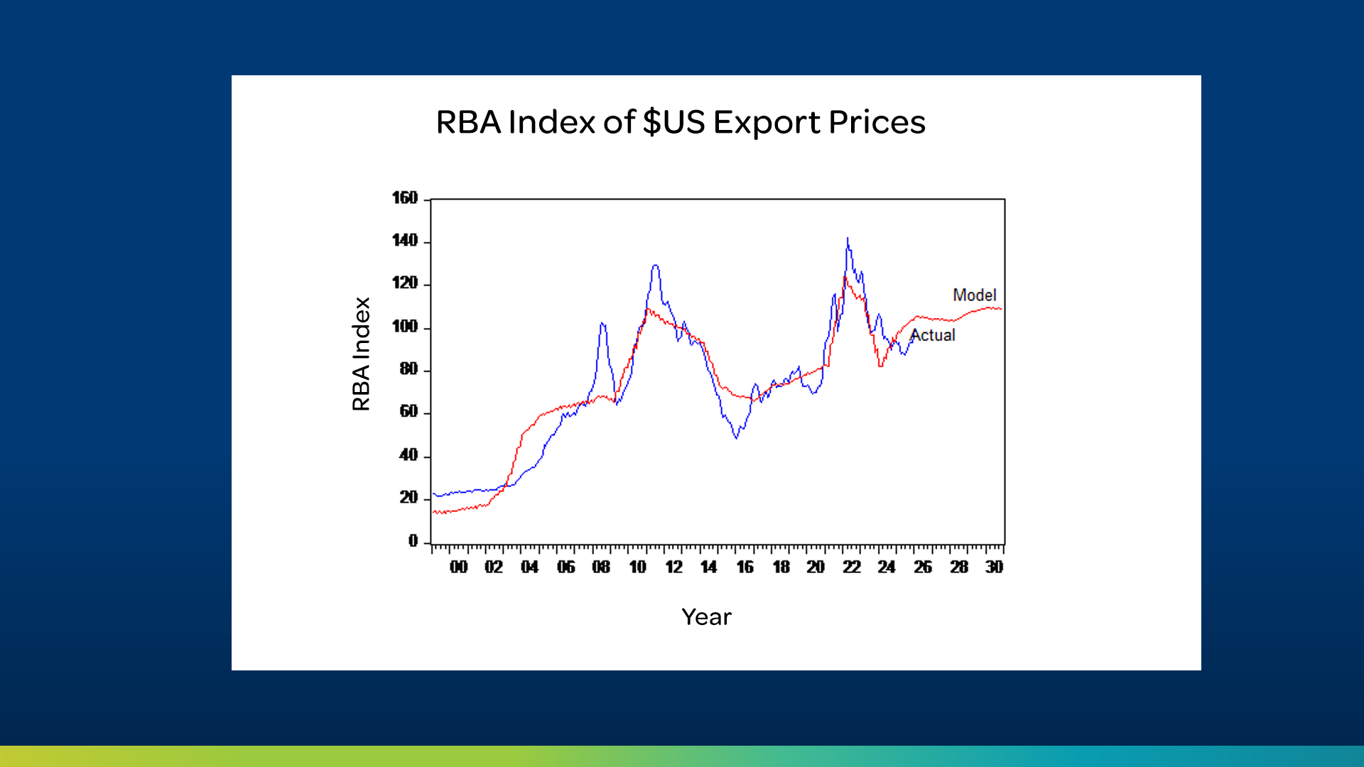The main driver is global demand from economies such as the US. Modelling shows the US budget deficit is the strongest predictor of Australian export prices.