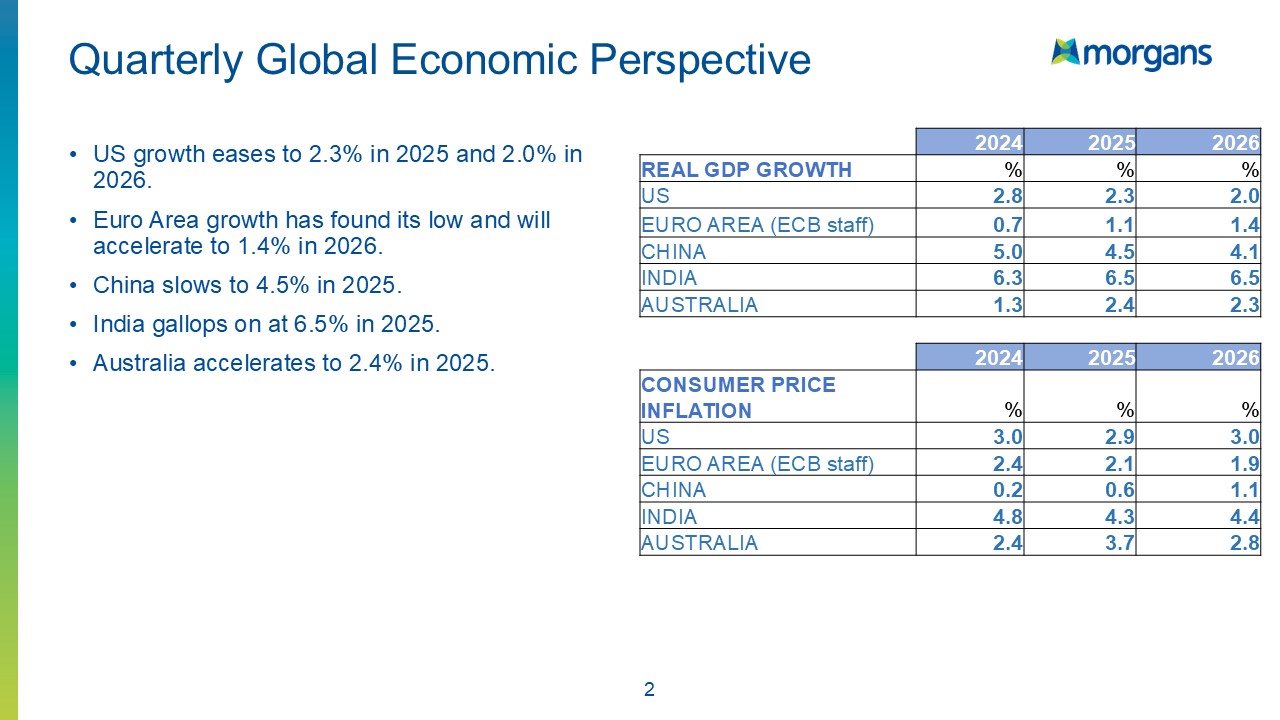 The first page discusses the outlook for the world economy. I wrote this about six weeks ago, and since then, the U.S. economy seems to have softened a bit. This softness aligns with my model of the U.S. economy. Initially, I expected 2.3% growth this year, but now I'm thinking it might be closer to 2%. Looking ahead to 2026, I believe next year will see slower growth. With US growth closer to 1.9%.