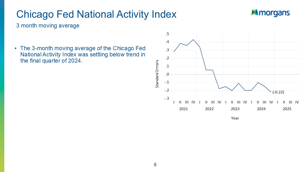 The U.S. economy is facing a series of challenges, particularly concerning US GDP growth. The three-month moving average of Chicago Fed National Activity Index stands at -.20, indicating that the economy is trending below average. The latest monthly number recorded is -0.19, suggesting that the economy is running at around 2% growth.
