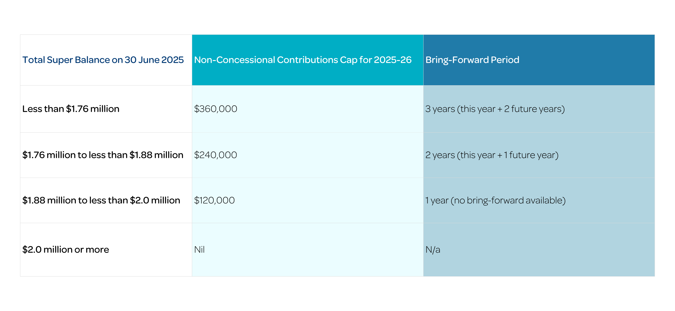 The “Bring Forward” Rule: The most significant feature of non-concessional contributions is the "bring-forward" rule, which allows you to make a larger lump-sum contribution by using up to two years of future caps. This rule is available to individuals under age 75 (at some point in the financial year).The amount you can "bring forward" depends on your total super balance at the end of the previous financial year as per the table below.