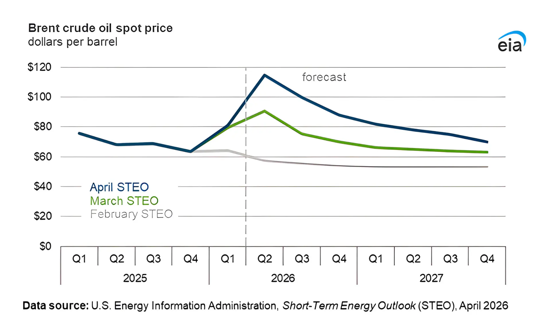 Their projections show oil prices easing gradually toward around US$80 per barrel only by the end of the first quarter next year. From there, prices fall further toward roughly US$70 per barrel by the end of 2027